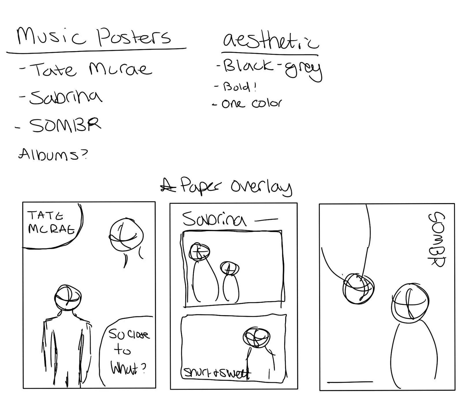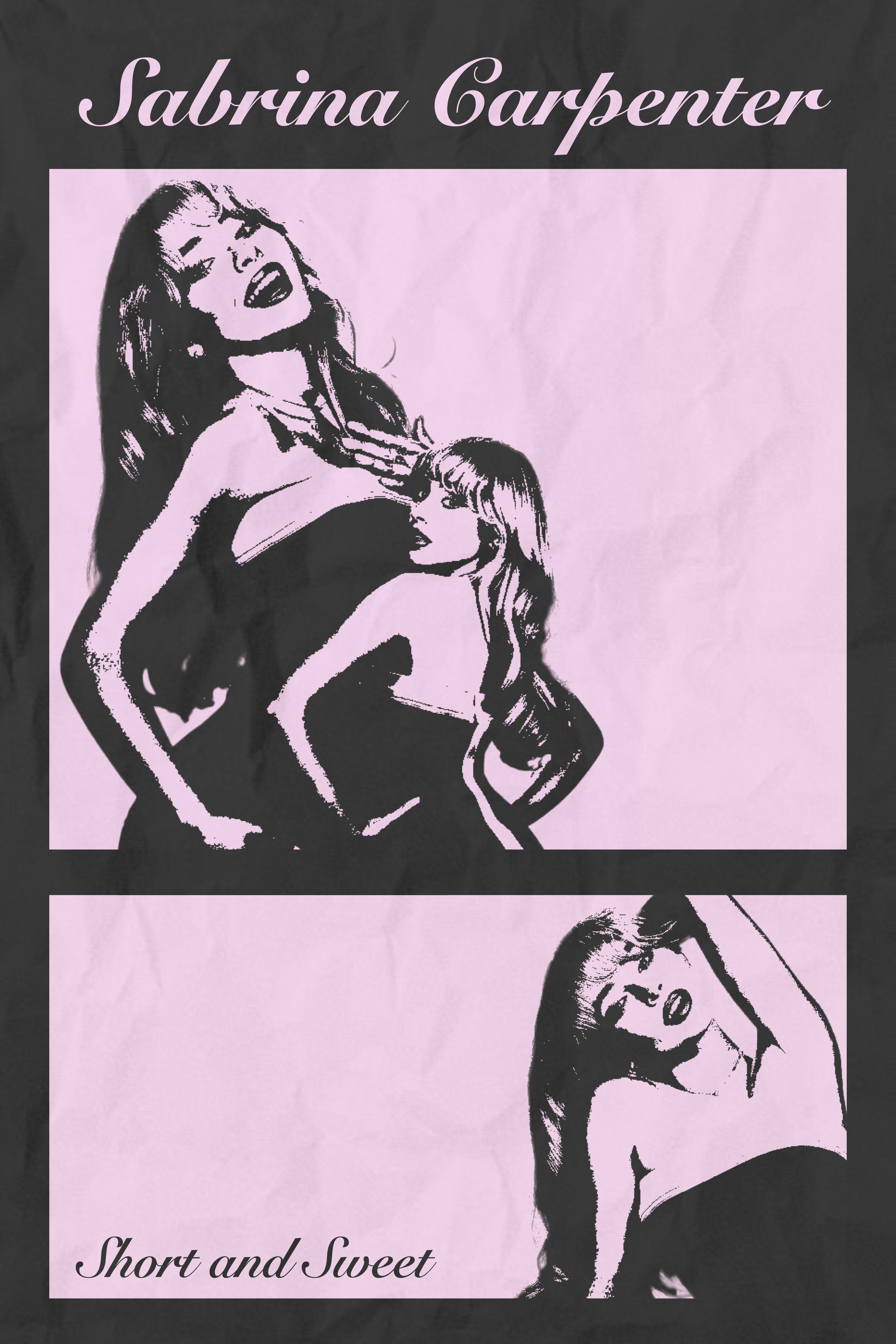 These posters were created to explore the contrast between grungy textures and minimal design while visually translating the identity of each artist’s music. The aim was to capture the mood, energy, and personality of Tate McRae, Sombr, and Sabrina Carpenter through bold but controlled visual compositions that reflect their sound.