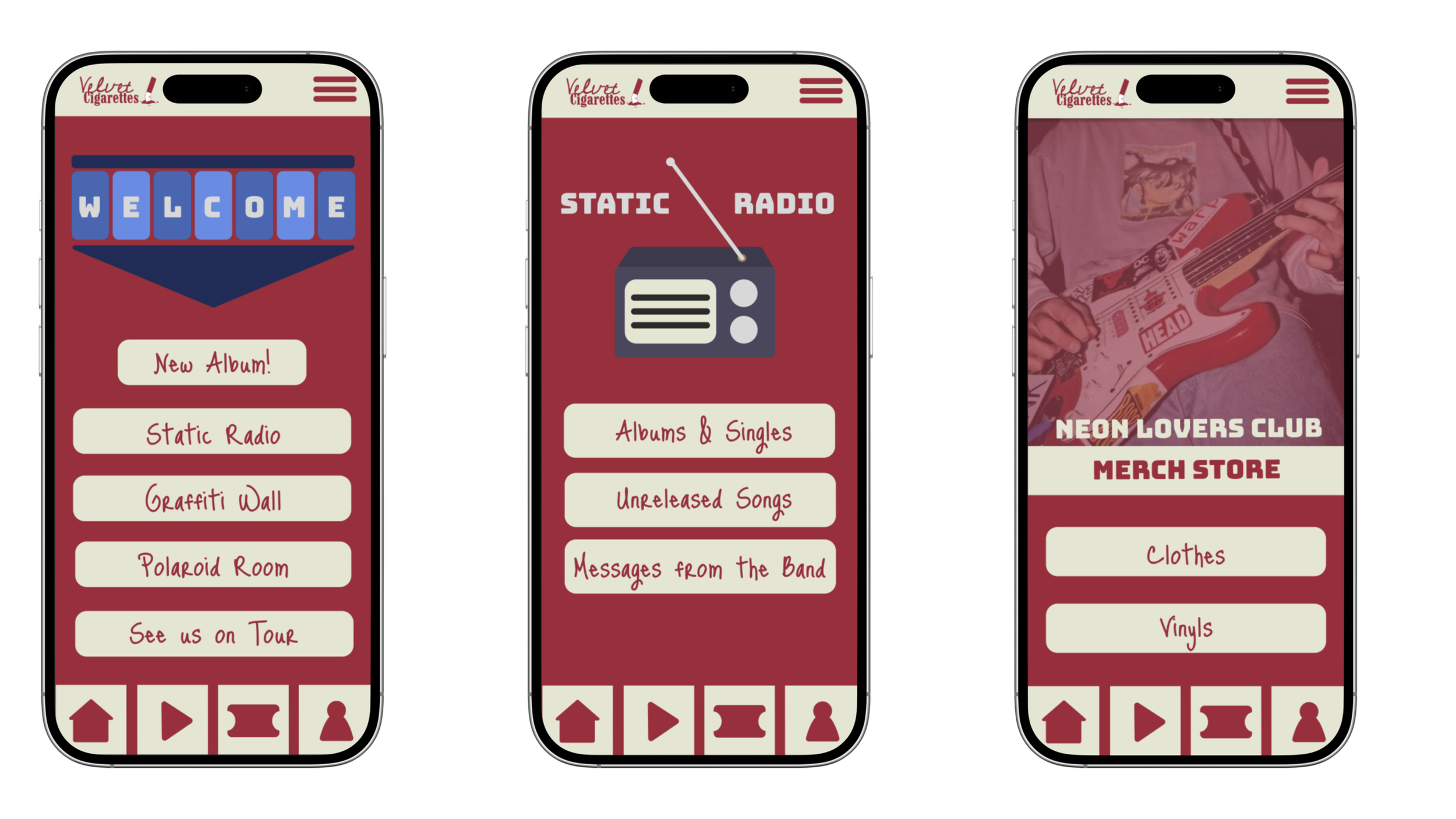 The app is designed as a central hub for fans to fully engage with The Velvet Cigarettes. It allows users to stream music, purchase merch and tickets, and access behind-the-scenes band content, and so much more all in one place. The interface is clean and easy to navigate while maintaining the band’s gritty, vintage-inspired aesthetic.
