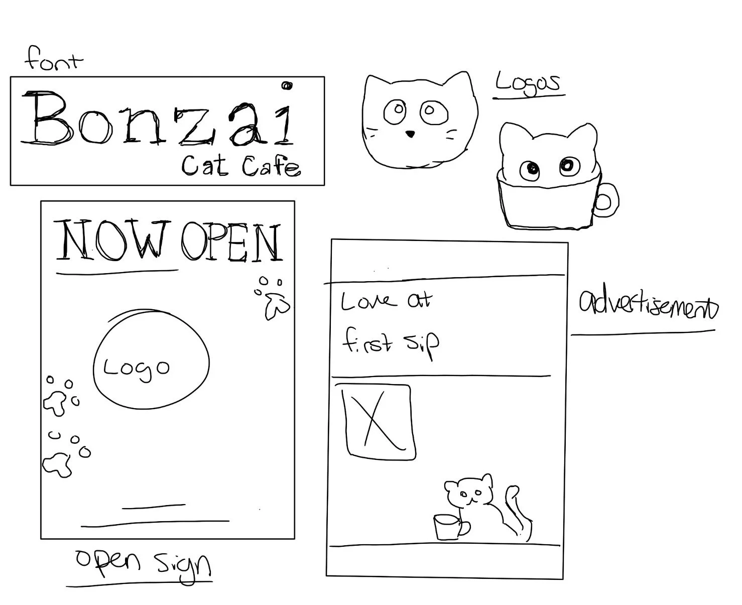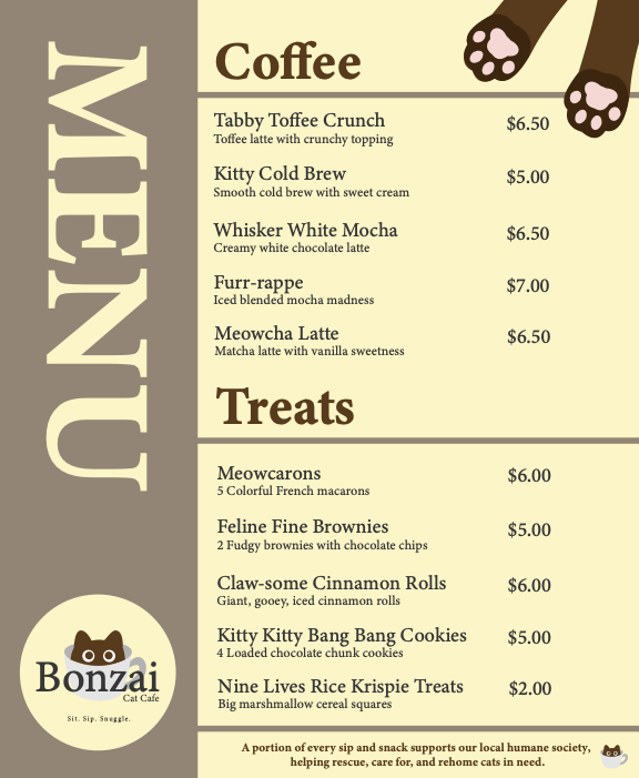 The Bonzai Cat Cafe brand guide establishes a warm and playful identity, using yellows, browns, and greys to create a cozy, inviting atmosphere.